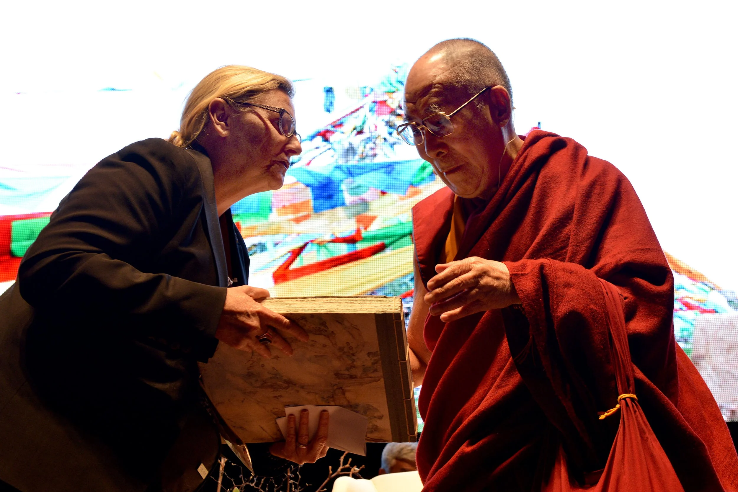 Lynn Bain, General Manager of Dalai Lama in Australia presenting His Holiness the Dalai Lama with the book of Birthday Wishes, 2015