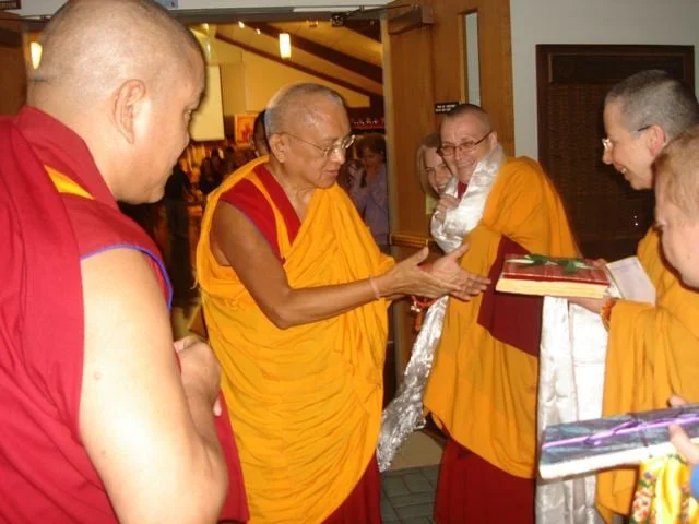 Kyabje Lama Zopa Rinpoche being presented with the Noble Sanghata Sutra by Ven. Thubten Chokyi and Ven. Katy Cole from the Liberation Prison Project, 2009
