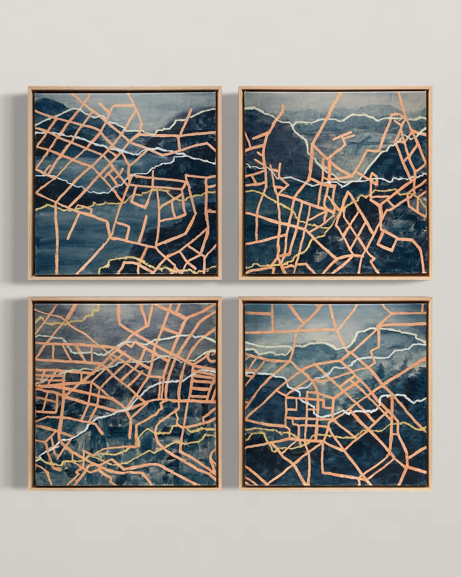 Each panel depicts a landscape overlaid with gilded roadmaps and topographies. From the first mark on the linen there is destruction: chaotic gilding slashes through terrain, erasing and re-inscribing paths. Layers rupture and repair one another as maps, paths, trails and trials surface, only to be repaved.