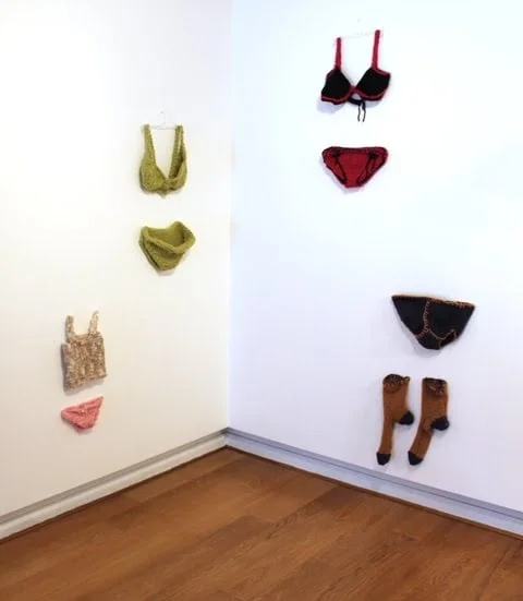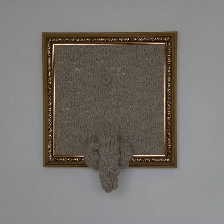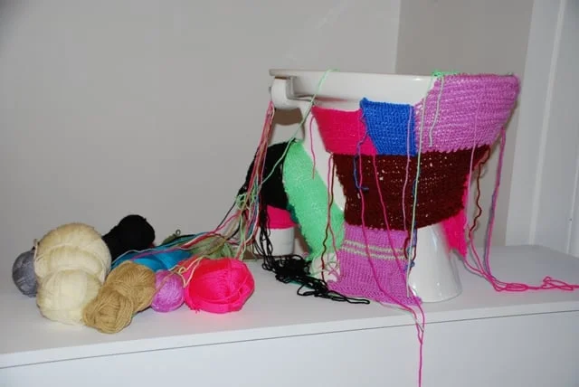 The knitted object, reminiscent of a knitting machine, denotes the automation of chamber pot duty, which was most definitely one of the least favoured chores in the household.